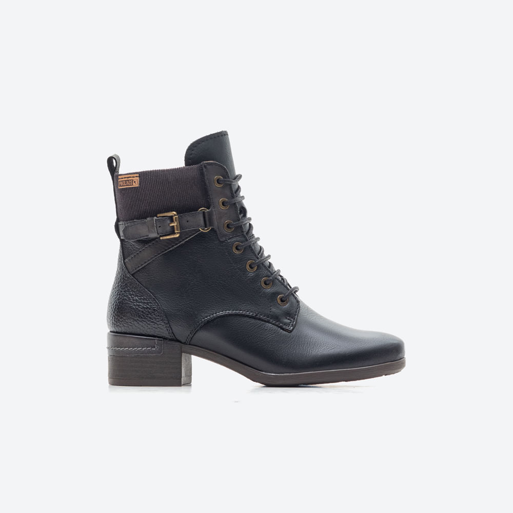 Estos botines de la marca Pikolinos te enamorarán por su diseño único y detalles especiales. Además de su comodidad, destacan por su diseño original en el que los cordones se fusionan con una hebilla para ajustarse a tu pie a la perfección. Te sentirás única en todo momento. Presenta plantilla y collarín acolchado y forro de tejido eco reciclado al 50%. La altura del tacón es de 4 cm aprox. y la altura total de la caña es de 12 cm aprox. Con la compra de este producto, estás apoyando la fabricación responsable de la piel a través de Leather Working Group.