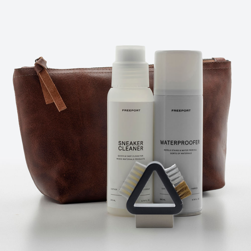 El Kit Mantenimiento Tenis Freeport está diseñado para quienes quieren mantener sus sneakers impecables sin complicaciones. Incluye un impermeabilizante PLSQ que protege la superficie contra humedad y suciedad, un cepillo multiuso PLM7 que permite remover polvo y residuos sin maltratar el material, un Sneaker Cleaner PMAL ideal para limpiar manchas ligeras o acumulación del uso diario, y una bolsa BTYC en carnaza miel perfecta para transportar los productos. Funciona para sneakers de cuero, mesh o materiales sintéticos. Para mejores resultados, se recomienda limpiar primero con el cepillo, aplicar el limpiador en movimientos suaves y terminar con el impermeabilizante una vez estén completamente secos.