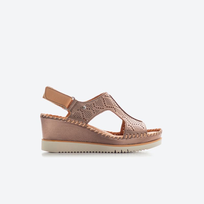 Estas sandalias de cuña combinan un diseño sofisticado con una comodidad excepcional, perfectas para agregar un toque elegante a cualquier atuendo de verano. Confeccionadas en cuero de alta calidad con un acabado metálico y detalles perforados, estas sandalias no solo son transpirables sino también llamativas. La plantilla acolchada y la suela de goma antideslizante aseguran confort y seguridad al caminar. El diseño incluye un cierre de hebilla ajustable que permite un ajuste personalizado. El detalle de costura a mano a lo largo de la suela agrega un toque artesanal. Estas sandalias son ideales para quienes buscan combinar estilo y comodidad en sus días más activos. La altura de la cuña es de 7 cm aprox. La piel de este modelo procede de la fabricación responsable de la piel a través de Leather Working Group.
