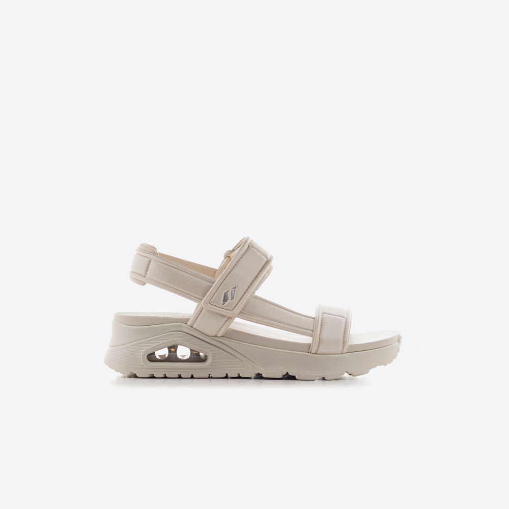 Sandalias veganas Skechers Uno - Basical con diseño deportivo y elegante. Presentan capellada de nailon en relieve con correa trasera ajustable, plantilla acolchada Yoga Foam y entresuela Skech-Air con airbag visible para una pisada suave y estable. Con una altura de 3,8 cm, ofrecen comodidad durante todo el día. Para conservarlas, limpiar con un paño húmedo y evitar la exposición prolongada al sol.