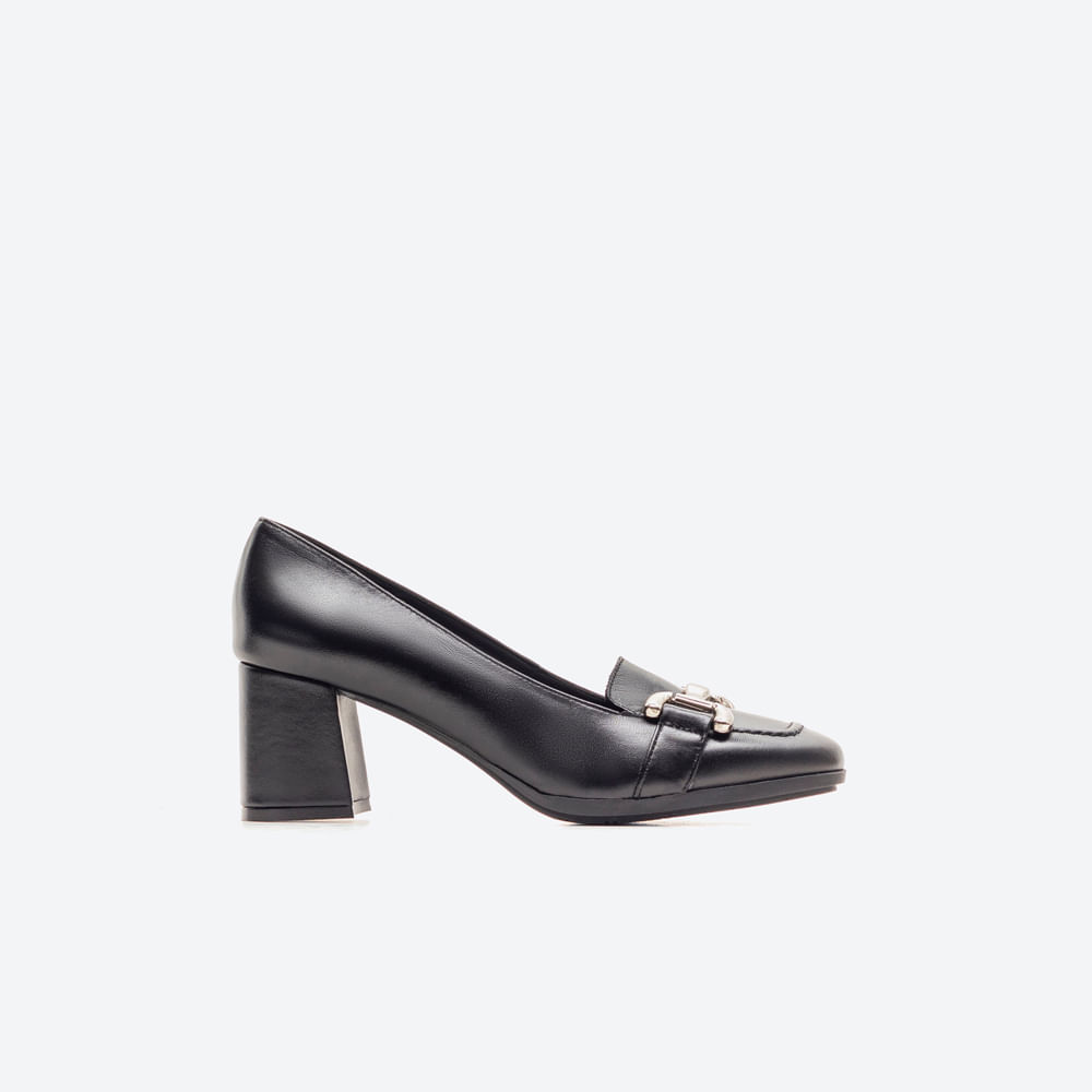 Este zapato de tacón medio combina elegancia y funcionalidad, ideal para complementar tus atuendos de oficina o eventos formales. Confeccionado en piel de alta calidad y decorado con un detalle metálico en la parte frontal, aporta un toque sofisticado sin perder comodidad. Su tacón de 5 cm ofrece la altura perfecta para estilizar la figura mientras se mantiene la estabilidad y confort en cada paso. Perfecto para quienes buscan un calzado versátil que puedan usar durante largas jornadas con estilo y comodidad.