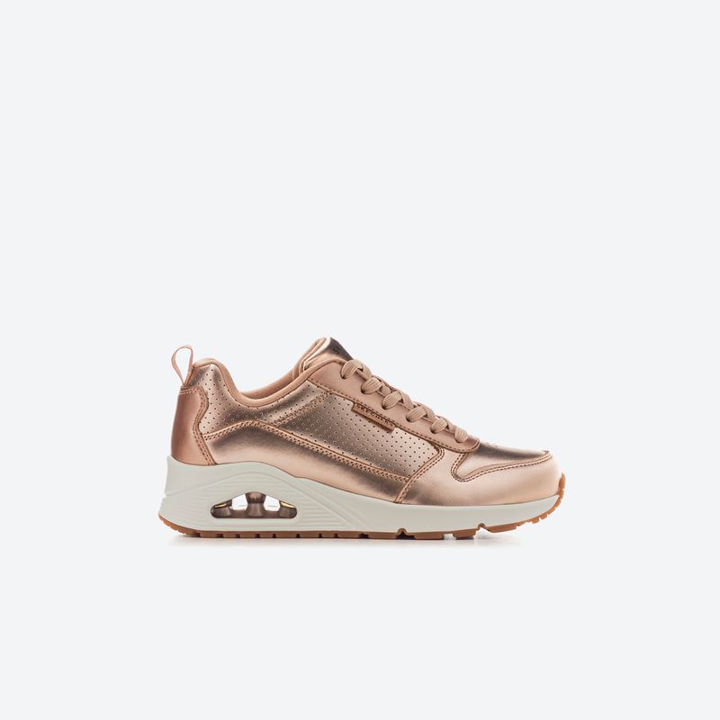 Las Skechers Street Uno - Metallixs combinan estilo llamativo y confort avanzado. Su exterior en cuero con acabado metálico aporta un toque moderno, mientras que la plantilla Skechers Air-Cooled Memory Foam brinda una amortiguación fresca y cómoda. La entresuela Skech-Air con cámara de aire visible mejora la absorción de impacto, ideal para un uso prolongado. Con su suela flexible y tacón de 3,81 cm, estas zapatillas ofrecen estilo urbano y soporte diario en cada paso.