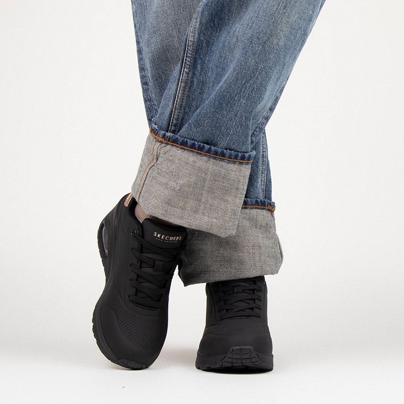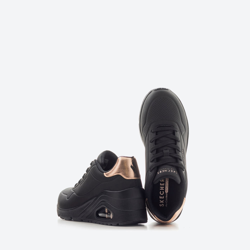 Las Uno Wedge - HI Steps de Skechers elevan tu look con su diseño moderno y su cuña con cámara de aire Skech-Air visible. La parte superior de durabuck con detalles metálicos en duraleather aporta un toque audaz y sofisticado. La plantilla Air-Cooled Memory Foam ofrece comodidad y frescura desde el primer paso, mientras la media suela con aire garantiza una amortiguación ligera y suave. Una sneaker versátil que combina estilo urbano con tecnología para tu día a día.