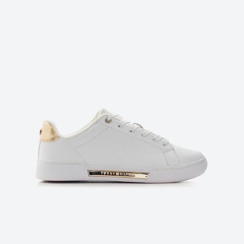 Estas zapatillas court de corte bajo de Tommy Hilfiger destacan por su estética limpia y sofisticada, ideal para elevar looks cotidianos con un toque elegante. Confeccionadas en cuero liso de alta calidad en color blanco, presentan un diseño equilibrado que se realza con detalles metálicos dorados, como la inserción con el logo en la entresuela lateral y el refuerzo brillante en el talón. El cierre de cordones permite un ajuste seguro y clásico, mientras que la suela de goma ofrece una pisada estable y duradera para el uso diario. Los sutiles detalles del monograma TH en los laterales u ojales refuerzan la identidad de la marca, convirtiendo este modelo en una opción versátil que combina fácilmente con outfits casuales o más pulidos.