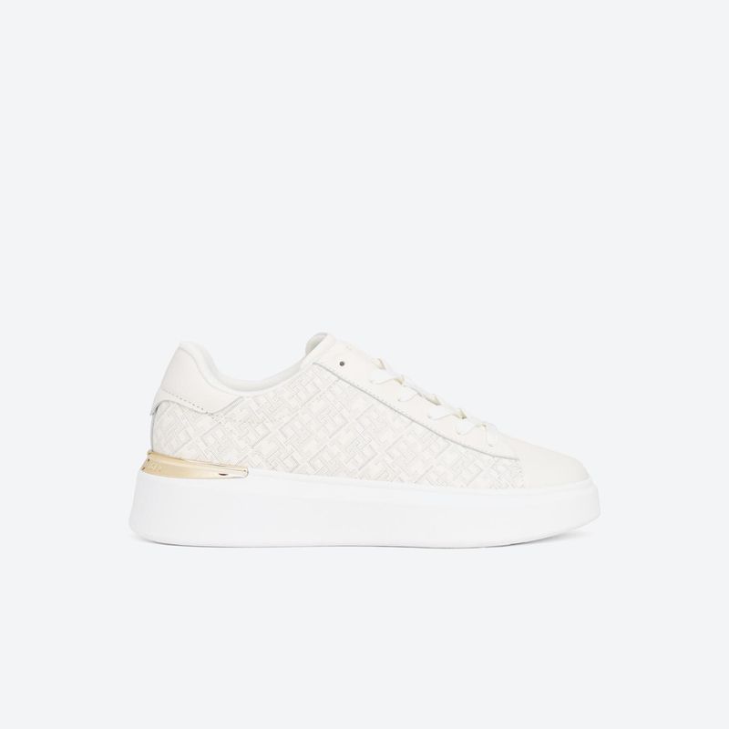 Estas tenis blancas de cuero con plataforma combinan una silueta limpia con detalles cuidadosamente trabajados que elevan el diseño. El monograma TH perforado aporta textura y carácter, mientras que el acabado metalizado en el talón añade un acento sutilmente sofisticado. Confeccionadas en cuero napa, incorporan forro de poliéster y plantilla extraíble que acompañan la pisada con mayor suavidad en el uso diario. La suela de goma termoplástica con plataforma proporciona una elevación equilibrada, manteniendo una estética urbana actual con el sello distintivo de Tommy Hilfiger.